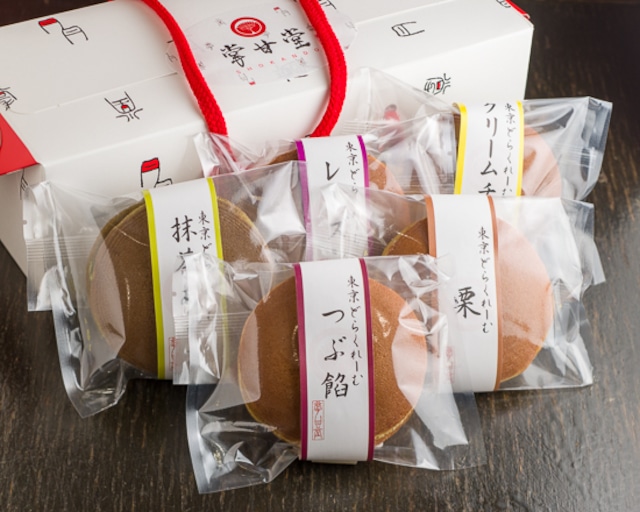 【内訳】 東京どらクレーム 5個入れ:1,100円 (生クリームにつぶ餡・抹茶小豆・栗・レーズン。クリームチーズを混ぜ合わせた生どら焼き です) クール便:200円